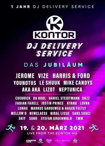 Am Freitag, den 19. und Samstag, den 20. März 2021 präsentiert Kontor Records an zwei Tagen jeweils 14 Stunden lang einen Livestream zum einjährigen Bestehen des Kontor DJ Delivery Services. Mit dabei sind 27 Top DJs wie Jerome, VIZE, Mike Candys, Harris & Ford, Neptunica, Le Shuuk, Younotus, LIZOT, TMW, Lunax, Markus Gardeweg, Da Hool, DJ Mellow-D, AKA AKA, SONO und viele weitere. Zwei Tage Party mit den aktuellsten Dancetracks LIVE aus dem Kontor Headquarter an der Elbe.