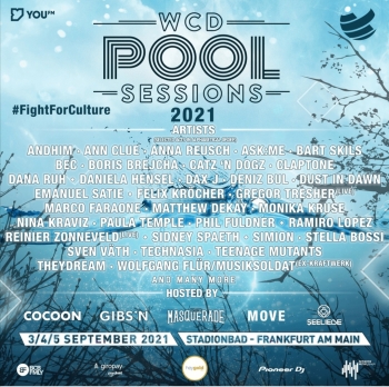 Die WCD Pool Sessions finden am 3./4./5. September 2021im Stadionbad unter dem freien Himmel Frankfurts mit einem einzigartigen Line Up statt. Somit freuen sich unter anderem schon jetzt auf die WCD Pool Sessions: die deutsche Techno-Legende und Cocoon-Gründer Sven Väth ... die derzeit erfolgreichste ungekrönte Techno-Königin aus Russland, Nina Kraviz ... Deutschlands Techno Queen, Monika Kruse … der Mann mit der goldenen Schnabelmaske und dem unverwechselbaren Tech-House-Sound, Claptone ... sowie Andhim, Bart Skills, Boris Brejcha, Dax J, Felix Kröcher, Gregor Tresher (live), Matthew Dekay, Paula Temple, Reinier Zonneveld (live), Technasia, Wolfgang Flür von Kraftwerk und vielen weiteren.