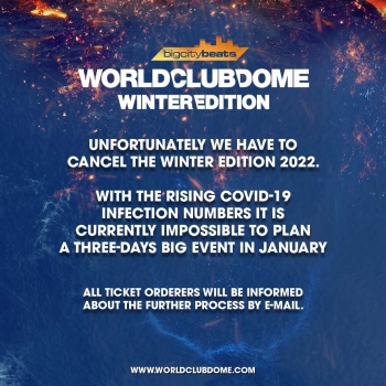 „Nachdem wir im September mit der WCD Pool Sessions in Frankfurt und insgesamt 25.000 Besuchern den Festival Sommer wieder eröffnet hatten, waren wir uns sicher, im Januar in Düsseldorf unsere WORLD CLUB DOME Winter Edition neustarten zu können. Derzeit erleben wir aber trotz der hohen Impfquoten einen massiven Anstieg der Neuinfektionen. Und zwei Monate vor dem Event können wir nicht absehen, wie die Politik darauf reagieren wird. Darum haben wir schweren Herzens beschlossen, die Winterausgabe des BigCityBeats WORLD CLUB DOME absagen“, erklärt Bernd Breiter.