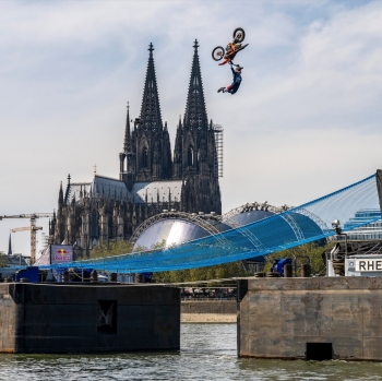 Rheinaufwärts bei voller Fahrt katapultiert sich Luc für seinen letzten großen Stunt vor den Türmen des Kölner Doms dann noch per Tsunami Backflip von Schiff zu Schiff und verfällt zurecht in Freudentaumel.