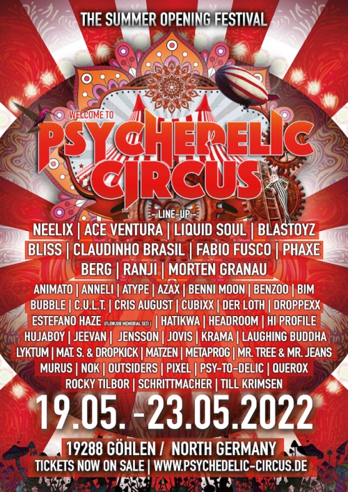 Der offizielle Kick-Off der deutschen Festival Saison 2022 steht mit dem Psychedelic Circus Open Air Festival unmittelbar bevor! Vom 19. bis 23. Mai 2022 steigt nach zwei Jahren Pause endlich wieder eine fantastische Reise durch die Welt der Goa Sounds. In Göhlen bei Ludwigslust finden Elfen, Magier, Artisten und Reisende aus allen Teilen der Erde zusammen, um in eine magische Welt einzutauchen.