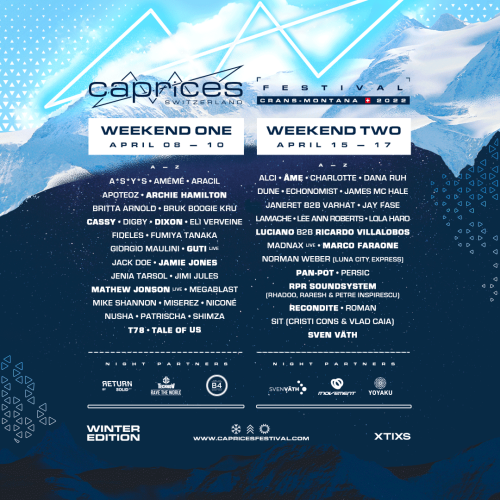 Das Caprices Festival ist das kultigste Bergfestival Europas und feiert seine 20. Ausgabe an zwei unvergesslichen Wochenenden im atemberaubenden Crans-Montana in der Schweiz. An den beiden Wochenenden vom 7. bis 9. April und vom 14. bis 16. April gibt es völlig neue Bühnen, die für das Festival typische anspruchsvolle Produktion, Überraschungsgäste, endlosen Wintersportspaß und elektronische Musik, die ein breiteres Spektrum als je zuvor abdeckt, mit DJs und Live-Acts.