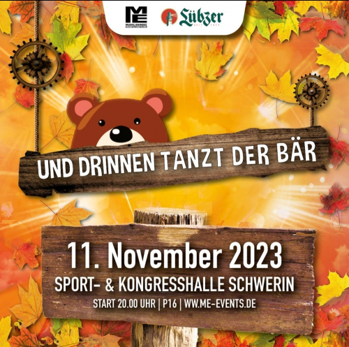 Jedes Jahr zum Herrentag versammeln sich einige der besten House- und Techno-DJs Europas auf der Freilichtbühne Schwerin, um das Open Air Event "Und draußen tanzt der Bär“ zu feiern. 2023 steigt bereits die 10. Ausgabe dieses Tagesfestivals. Zum Jubiläum wird es erstmals auch eine Indoor-Ausgabe Freiluft-Happenings geben. "Und drinnen tanzt der Bär“ steigt am 11. November 2023 in der Sport- und Kongresshalle Schwerin. Party auf drei Floors ist angesagt und liefert ein breites, musikalisches Spektrum von EDM über House, Techno, Hardstyle und PsyTrance.