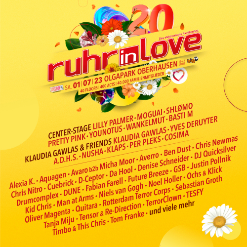 Das Familienfest der elektronischen Musikszene feiert am 01. Juli sein 20-jähriges Jubiläum. 2003 fand die erste Ausgabe von Ruhr-in-Love noch im Nordstern Park in Gelsenkirchen statt. Seit 2004 ist der OlgaPark in Oberhausen, das ehemalige Gelände der Landesgartenschau von 1999, die Heimat des Events. Zum runden Geburtstag werden auf 40 Floors wieder rund 35.000 Besucher:innen erwartet, die zu mehr als 400 DJs feiern. Anlässlich des Jubiläums wird es erstmals eine zweite Mainstage geben.
