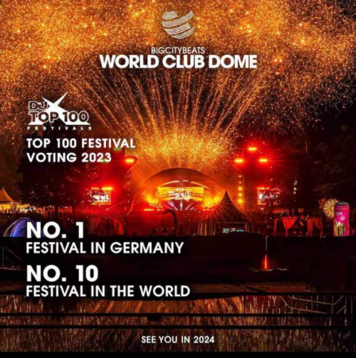 Soeben hat das englische DJ Mag, die international wichtigste Zeitschrift für elektronische Musikkultur, die Ergebnisse des diesjährigen Top 100 Festival Voting veröffentlicht. Dabei wurde der BigCityBeats WORLD CLUB DOME in Frankfurt, erneut zum besten Festival in Deutschland gewählt. Doch damit nicht genug. Nach einem 11. Platz im letzten Jahr in der Liste der wichtigsten Festival steigt der WORLD CLUB DOME 2023 in die Top 10 auf und wird in einem Atemzug mit Tomorrowland (Belgien), Ultra Music (USA), Gastonbury (UK), EDC (USA), Coachella (USA), Untold (Rumänien), Awakenings (Niederland) oder Creamfields (UK) genannt.