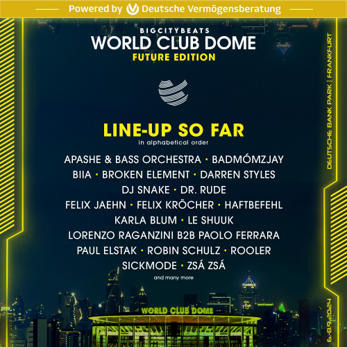 Und hier ist das bisherige Line Up der BigCityBeats WORLD CLUB DOME Future Edition 2024 in alphabetischer Reihenfolge: