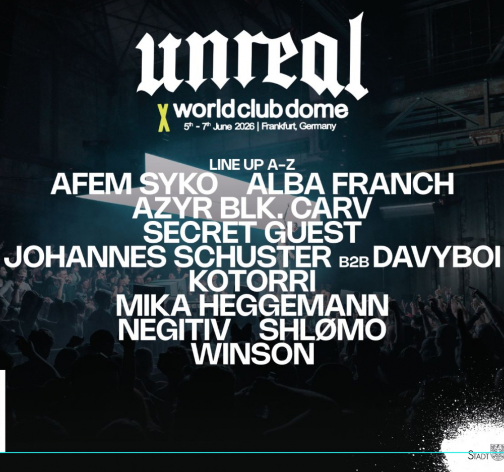 Mit der neuen Partnerschaft öffnet sich der WORLD CLUB DOME bewusst stärker für die Underground-Szene. UNREAL steht für rohe Energie, hohe Tempi und ein radikal gleichberechtigtes Cluberlebnis und besticht durch seine innovativen Produktionen welche weltweit bereits für Aufsehen sorgten - ohne VIP-Bereiche, ohne Glamour, ohne Hierarchien. Alle Besucher:innen teilen denselben Raum, dieselbe Intensität, dieselbe Musik.